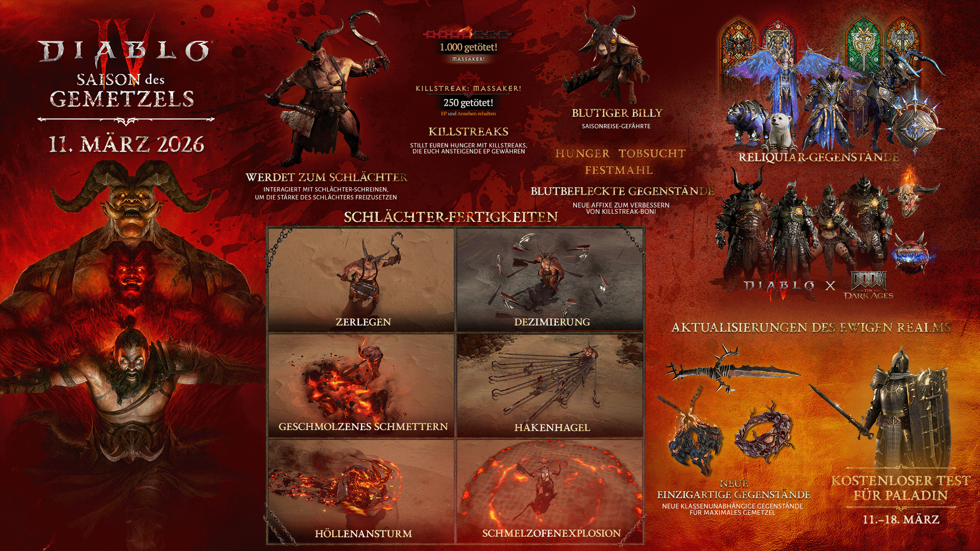 Ein verzerrtes Experiment erweckt ein dunkles Verlangen in euch und hinterlässt einen anhaltenden und fauligen Geruch von Frischfleisch. Die Saison des Gemetzels trifft am 11. März um 18:00 Uhr (MEZ) ein und verleiht euch die Macht, euch in den Schlächter zu verwandeln – eine Kraft, die ihr nur teilweise unter Kontrolle habt. Stillt euren Hunger mit Killstreaks, schlachtet euch durch Aktivitäten und verdient einzigartige und blutbefleckte Gegenstände, die eure Macht auf ganz neue und brutale Höhen bringt.