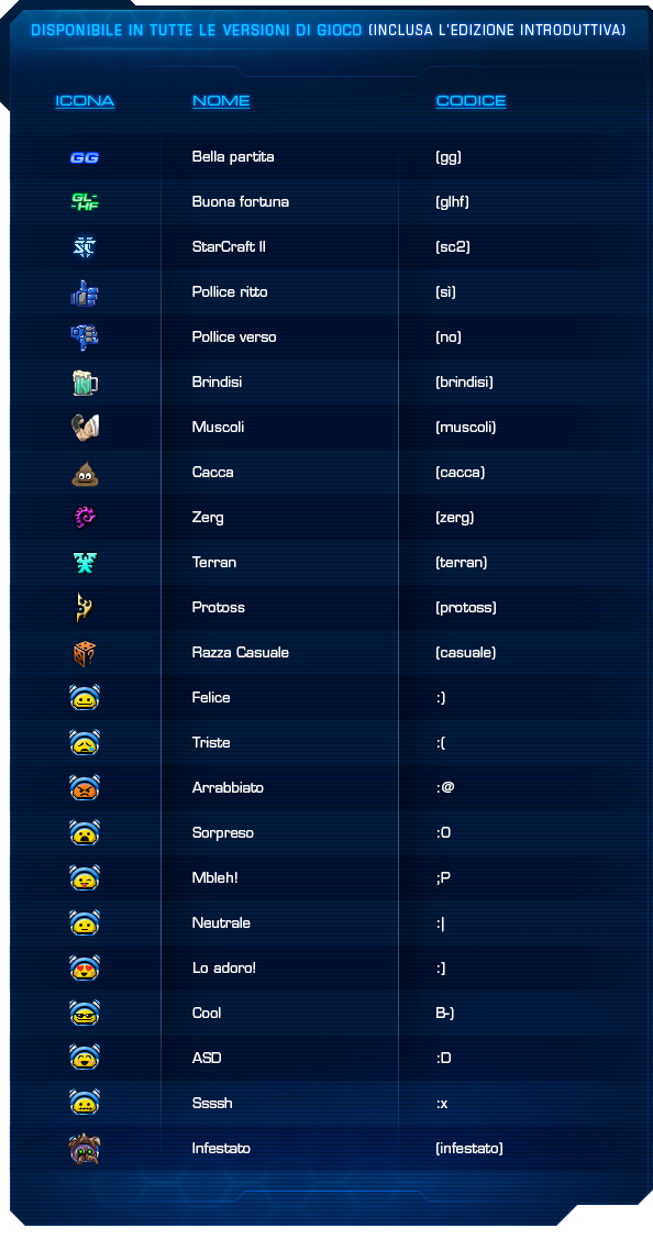 Al momento, le emoticon sono disponibili solamente in StarCraft II. Ciò significa che non saranno visibili ai vostri amici se stanno utilizzando un gioco Blizzard diverso da StarCraft II.