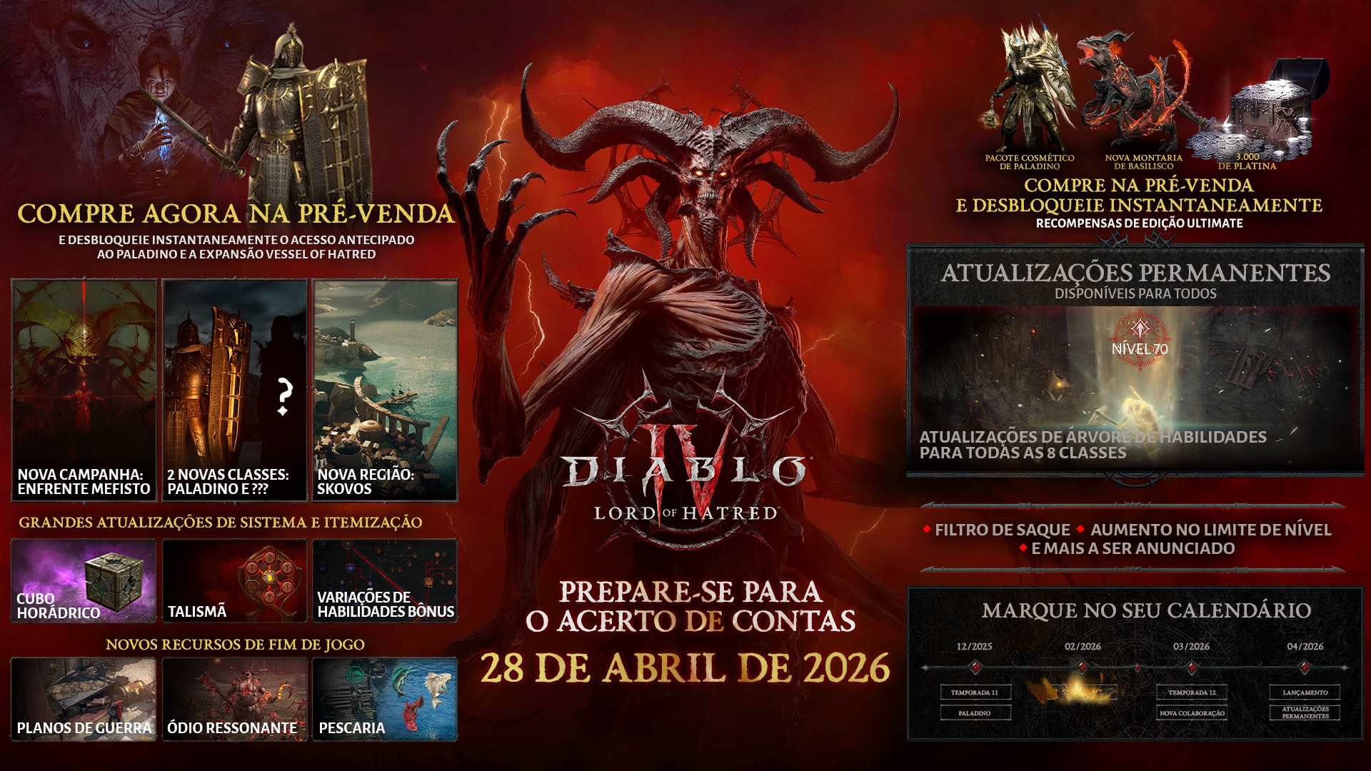 Resista contra o Mal Supremo Mefisto em uma nova e grandiosa campanha ambientada na região ancestral de Skovos. Compre na pré-venda e jogue imediatamente com a nova classe Paladino. Uma segunda nova classe será desbloqueada no lançamento, em 28 de abril de 2026, junto com grandes atualizações para Diablo IV.